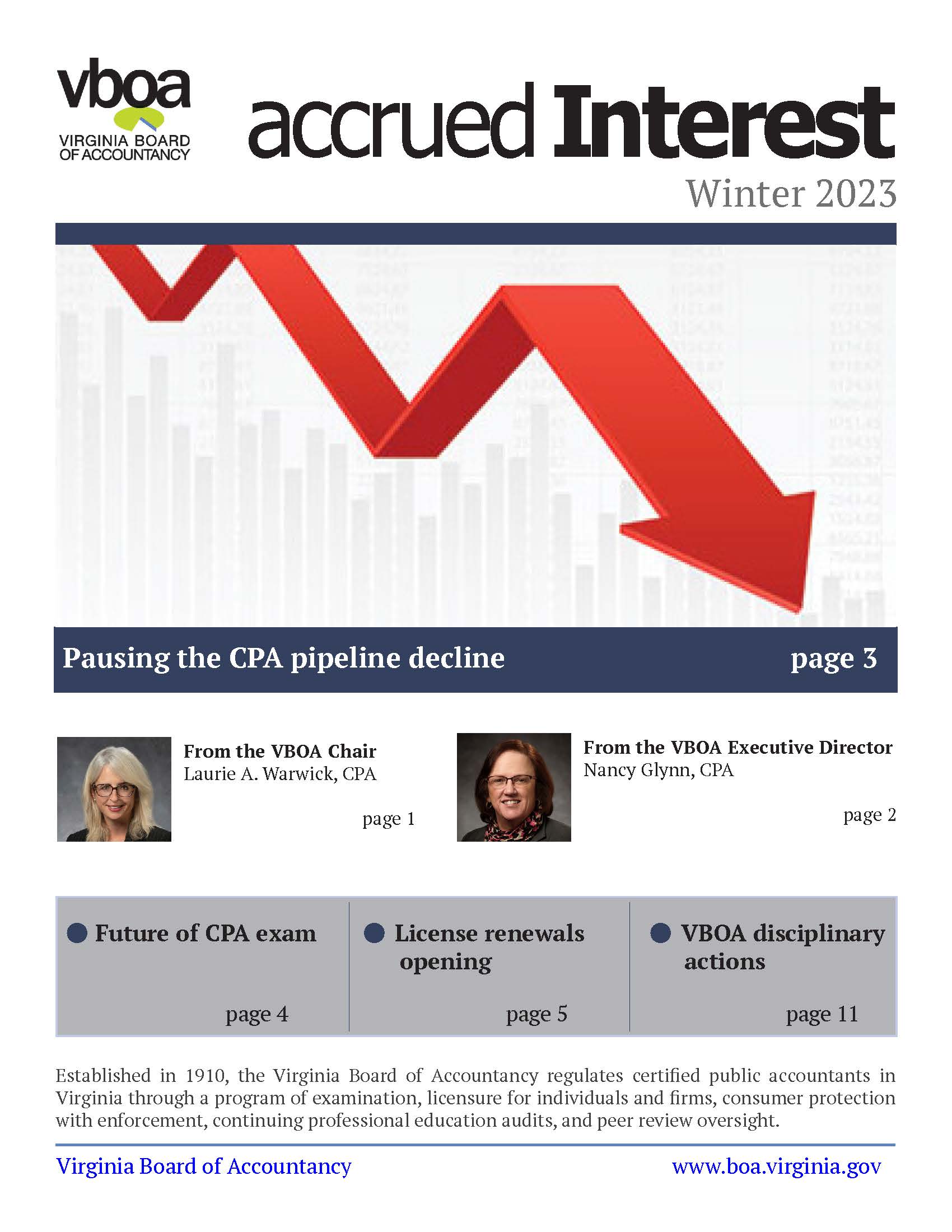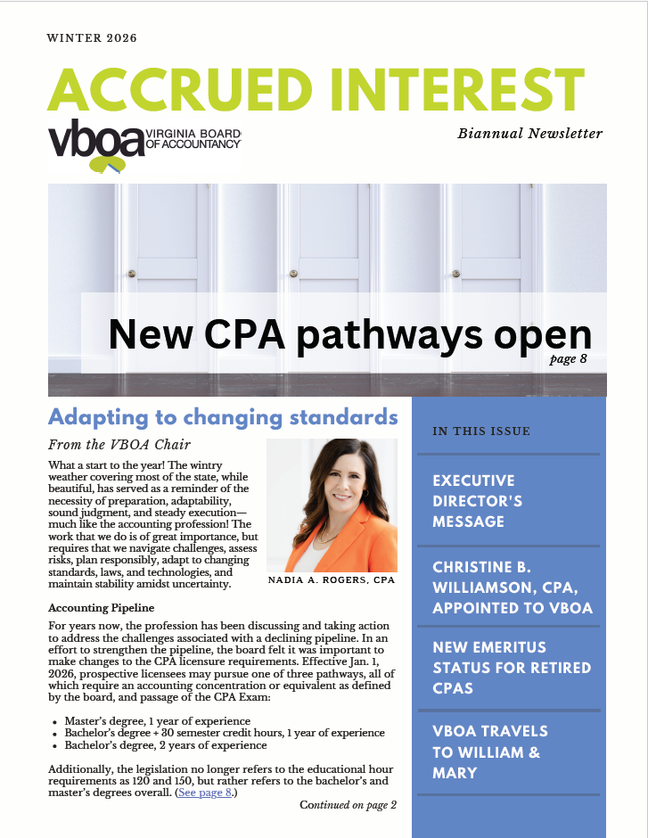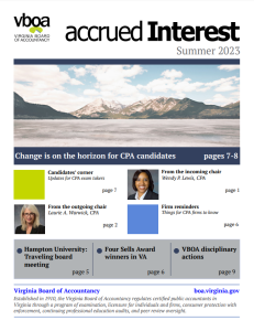 VBOA ከቨርጂኒያ ሲፒኤ እና ከፈተና እጩ ማህበረሰብ ጋር ተዛማጅነት ባላቸው ዜናዎች የተሞላ በዓመት ሁለት ጊዜ ጋዜጣ ያወጣል፣ ከዲሲፕሊን እርምጃዎች ጋር።